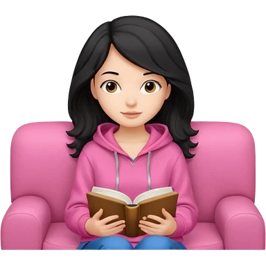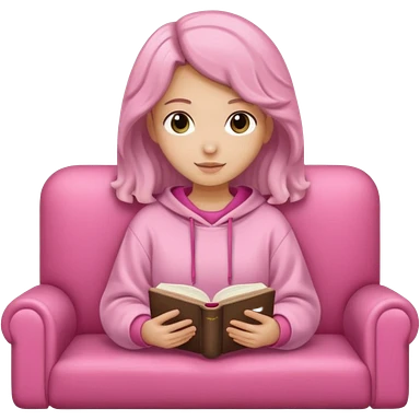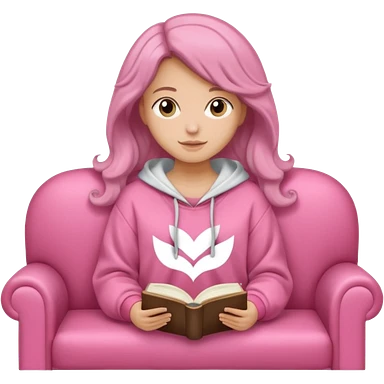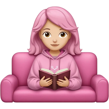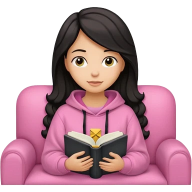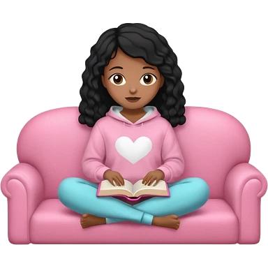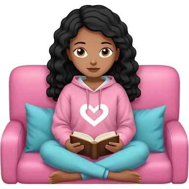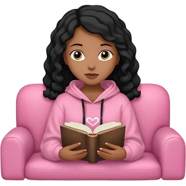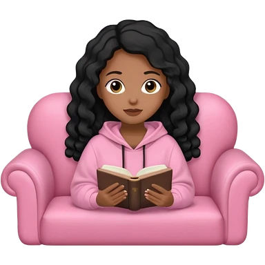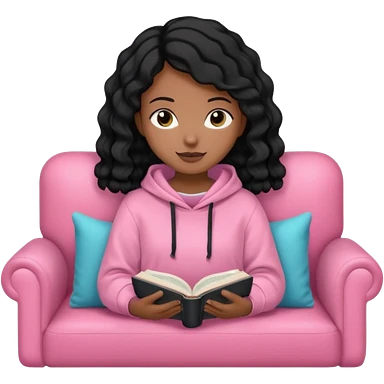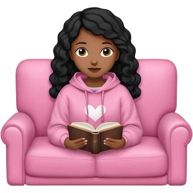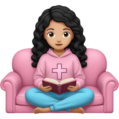 Una chica linda de cabello negro con ondas hasta los hombros de piel blanca con una sudadera rosa en un sofá cómodo y hermoso leyendo la biblia emoji