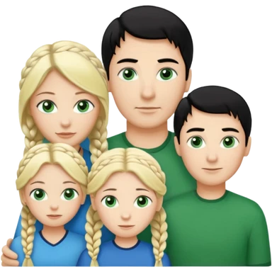 familia hombre de pelo negro con un mechon blanco de piel blanca ojos verdes, esposa de rubia con una trenza y ojos azules, hija rubia de ojos verdes y hijo pelinegro con ojos verdes emoji