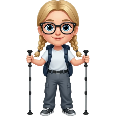 Chica rubia con dos trenzas de raíz gafas negras pantalones grises de montaña y forro negro con dos palos de pontaña y una mochila azul oscura emoji