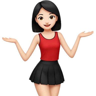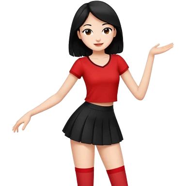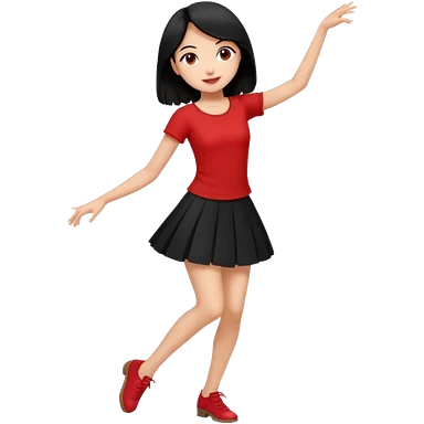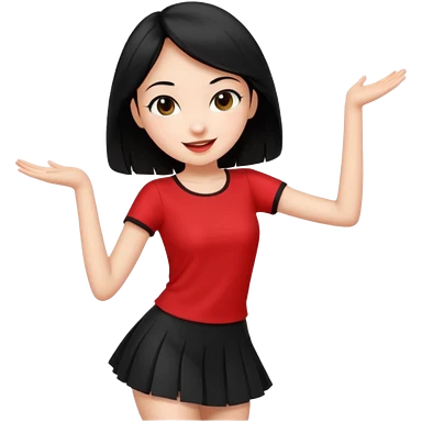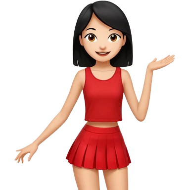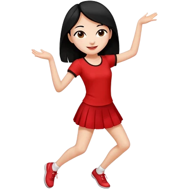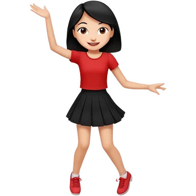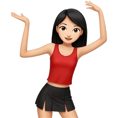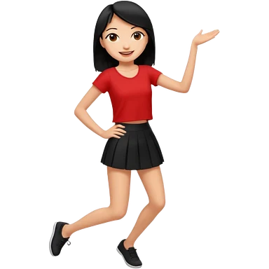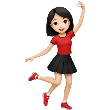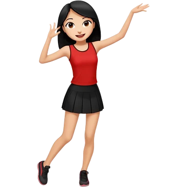 Chicas esbelta con falda corta negra y top rojo,pelo semi largo negro y lacio super feliz,pero bailando emoji