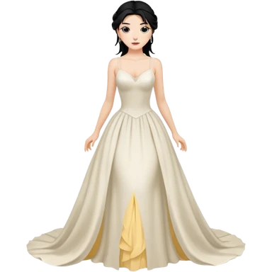Chica blanca,cuerpo entero, vestido boda tirantes finos, pelo negro recogido con mechones y sandalias emoji