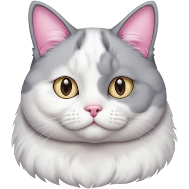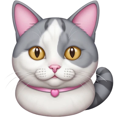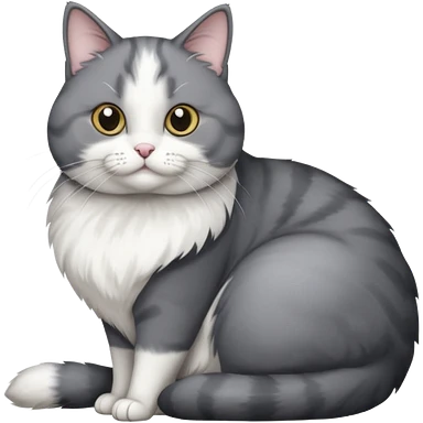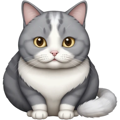 Gray and white tuxedo cat that is fat with white on top of tail and white on nose emoji