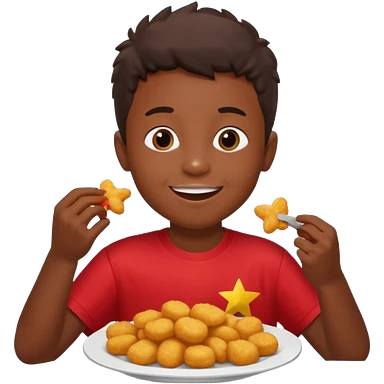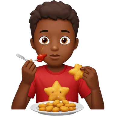 A boy with dark skin wearing a red and yellow t-shirt, eating star-shaped chicken nuggets with ketchup sauce. emoji