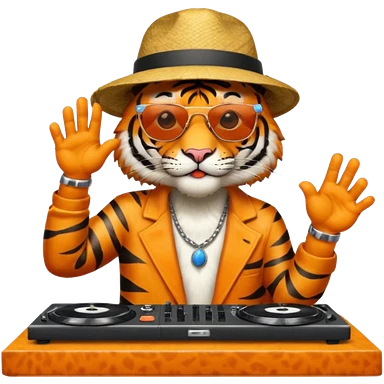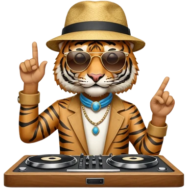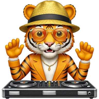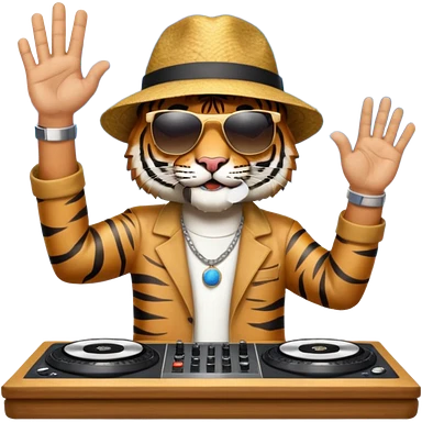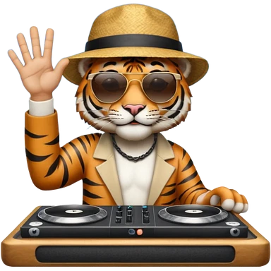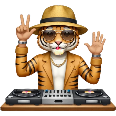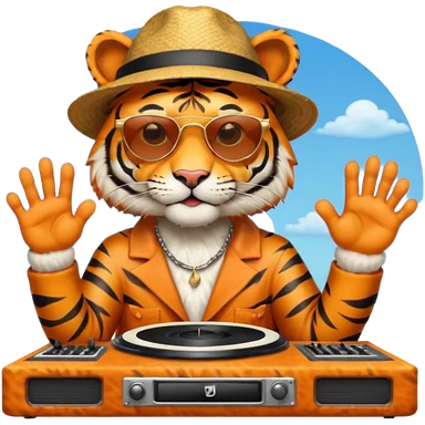 Un tigre con sombrero estilo cubano, una mesa de dj y gafas de sol. Una mano en la mesa de dj y la otra mano señalando al cielo a Dios emoji