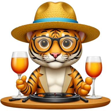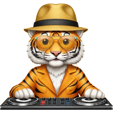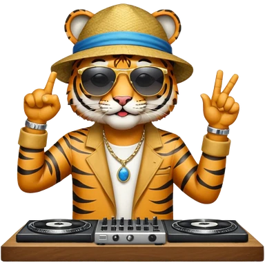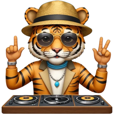 Un tigre con sombrero estilo cubano, una mesa de dj y gafas de sol emoji