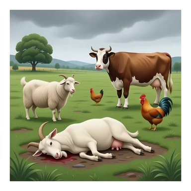 Sick and dying goats, sheep’s, chickens, cows in a field emoji