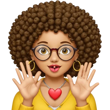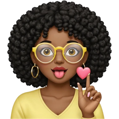 chica con piel morena, cabello rizado afro, vestida de amarillo, con candongas y que use lentes, saque la lengua, y mientras hace un corazón con las manos emoji
