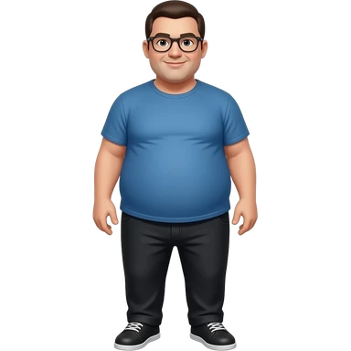 chico con camiseta azul pantalones negros pero con piernas zapatos i que tenga mas 18 años i que el chico sea gordo GAFAS de color naranja emoji | AI Emoji Generator