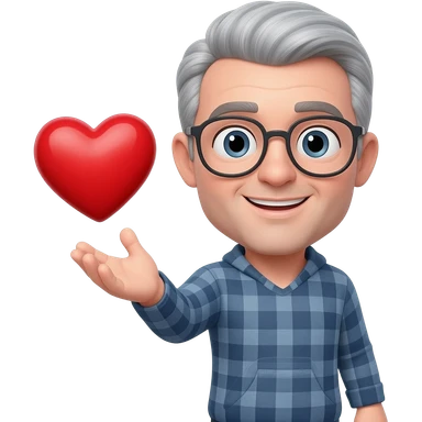 uomo con capelli grigi e occhiali che lancia cuori emoji