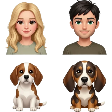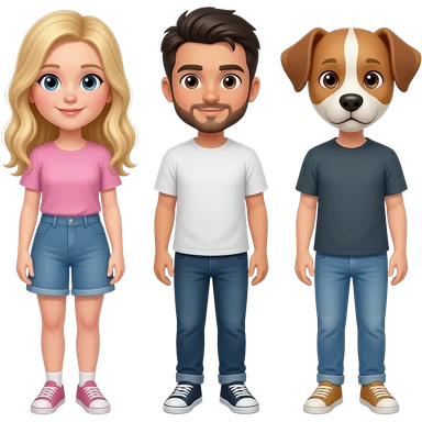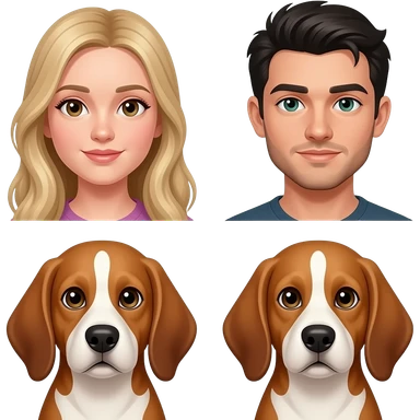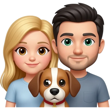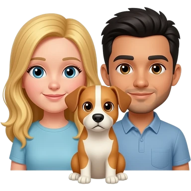 la chica pelo largo y rubia y piel blanca mediana, el chico misma piel, con barbita fina y pelo negro, y el perro como el default, orejas hacia abajo con orjas y donde los ojos marrones y entremedio blanco, hazlos que esten pegaditos como si fuese un emoticono de whatsapp emoji