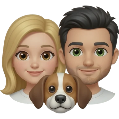 Pareja y perro estilo emoticono de WhatsApp, solo caras, muy juntos. Chica con pelo largo rubio, piel clara y ojos marrones. Chico con piel clara, pelo negro, barba fina visible y ojos verde oscuro. Perro estilo default, orejas caídas, marrón con blanco entre los ojos. emoji