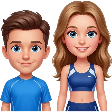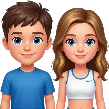 chico grande vetido de azul y chica grande vestida de blanco con un top corriendo, el chico castanyo i con pelo corto y la chica pelo suelto y un poco rubia pero castaño y los dos tienen ojos azules son hermanos emoji | AI Emoji Generator