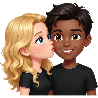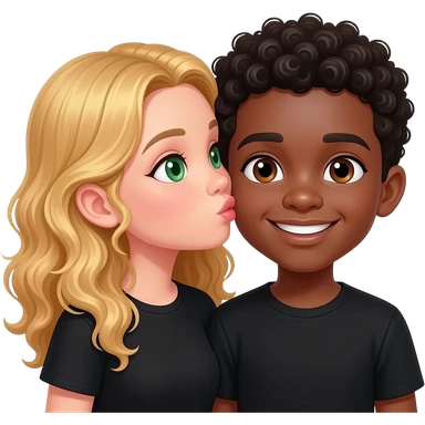 Chico negro da beso a chica rubia con pelo rizado ojos verdes. Van vestidos de negro los dos y sonrien emoji | AI Emoji Generator