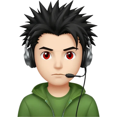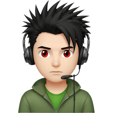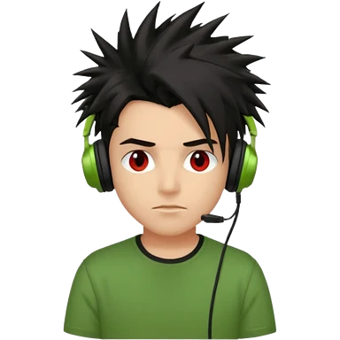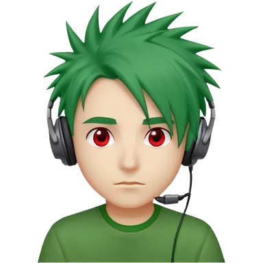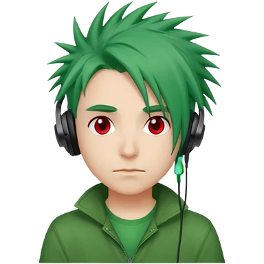 chico pelo medio largo ojos rojos y una camisa verde pelo tipo spike y unos audifonos pelo negro y mas voñuminoso emoji | AI Emoji Generator