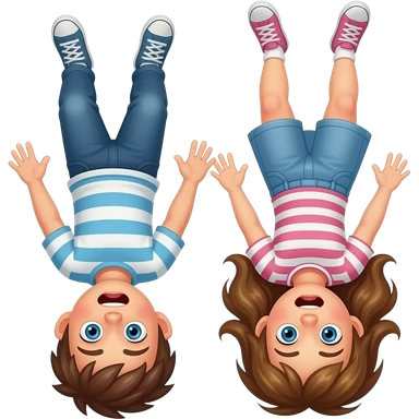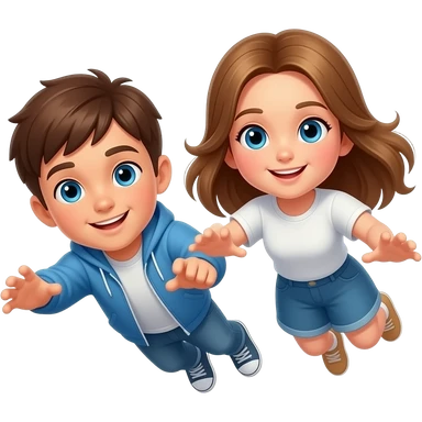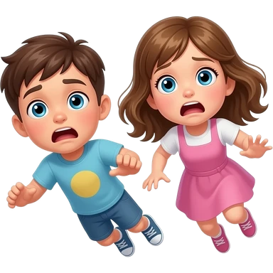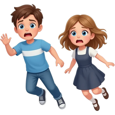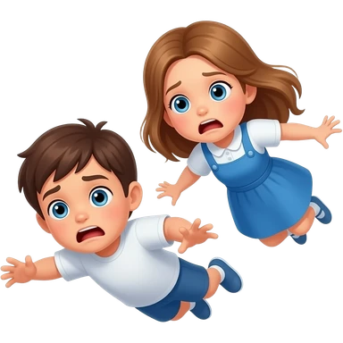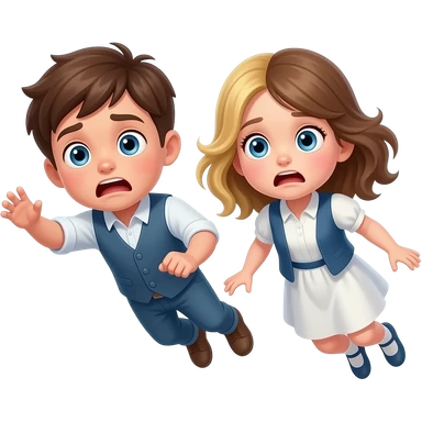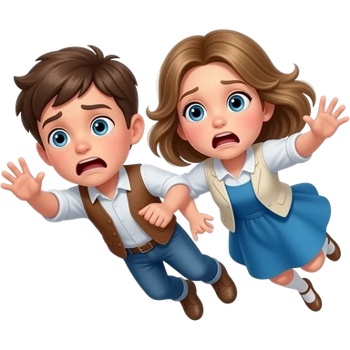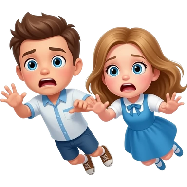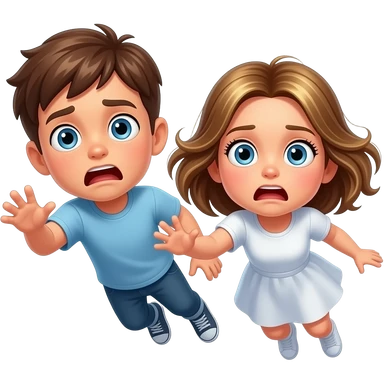 chico y chica caiendo del cielo asustados, el chico castanyo i con pelo corto y la chica pelo suelto y un poco rubia pero castaño y los dos tienen ojos azules son hermanos la chica con la ropa blanca i vestido azul caiendo de un agujero negro emoji | AI Emoji Generator