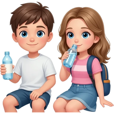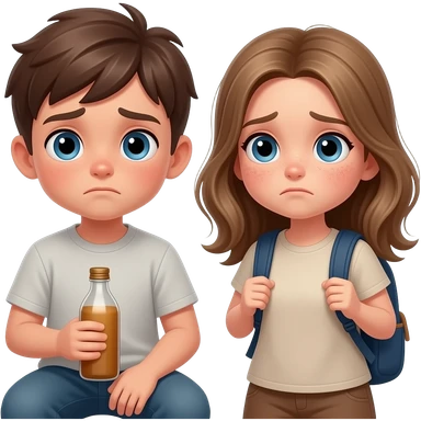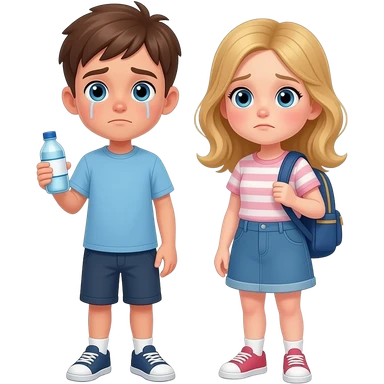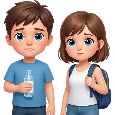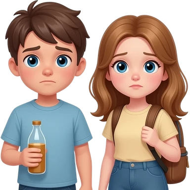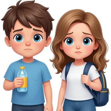 chico y chica cansados el chico castanyo i con pelo corto y la chica pelo suelto y un poco rubia pero castaño y los dos tienen ojos azules son hermanos el chico con una cantimplora de agua i la chica con una mochila. estan depie i cansados. se les ve los pies emoji | AI Emoji Generator