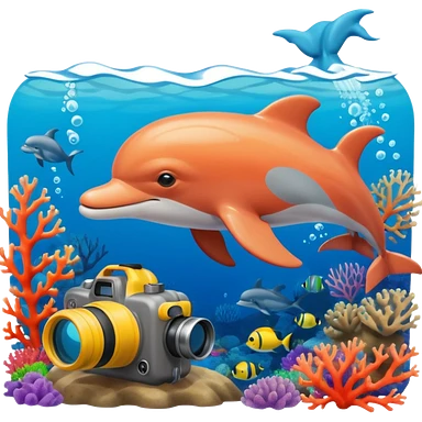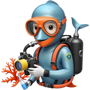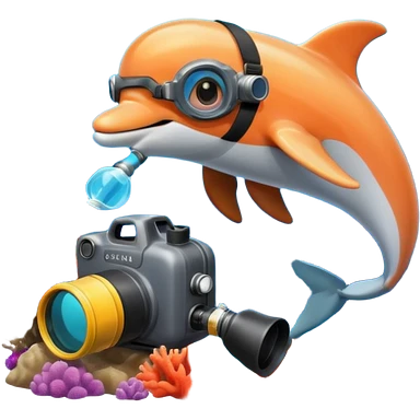 A brave dolphin in diver mask and oxygen tank, exploring coral with a waterproof camera. emoji