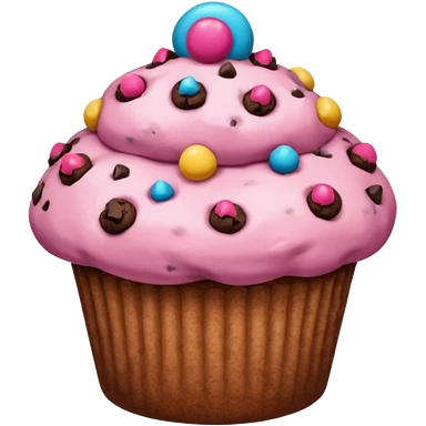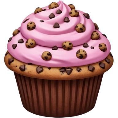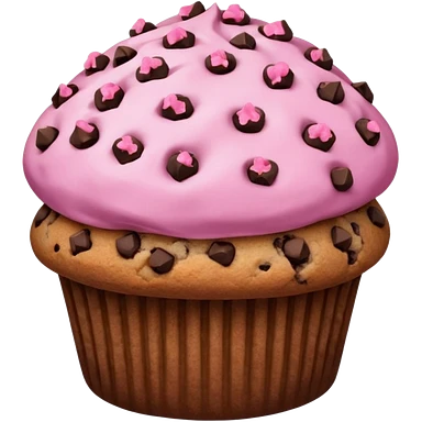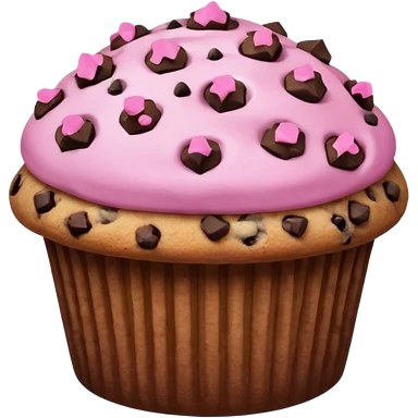 A pink muffin with chocolate chips and chocolate chip cookie topping emoji