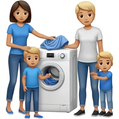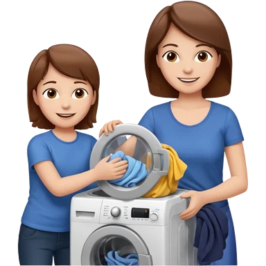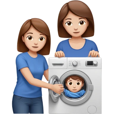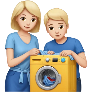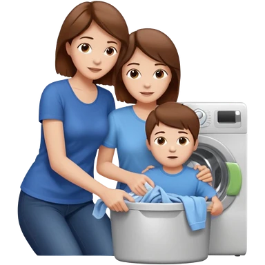 Mother and little son with brown hair putting clothes in the washing machine emoji