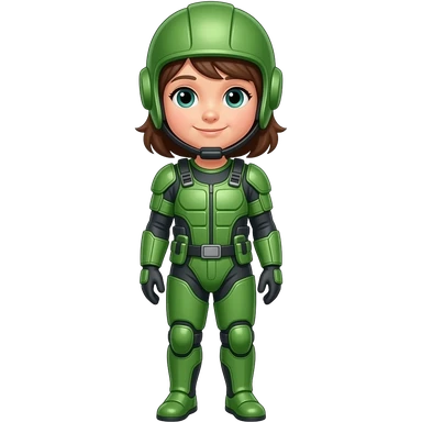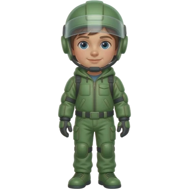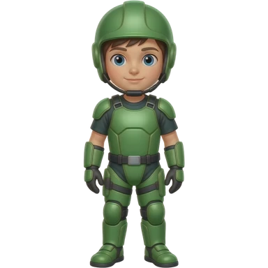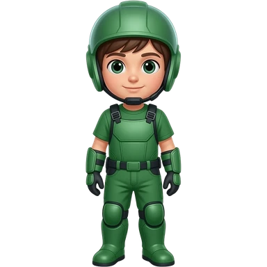 Child standing upright, green protective gear over simple clothes, relaxed upright posture. emoji