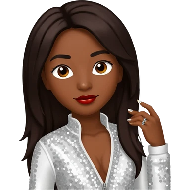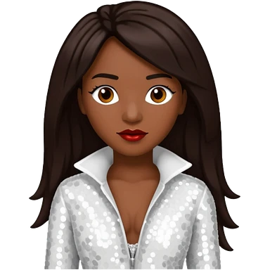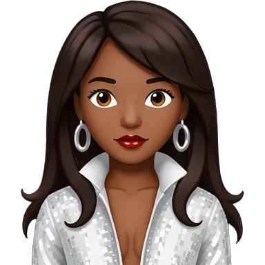 Chilli from TLC with dark skin, long dark brown hair, white sequin outfit emoji