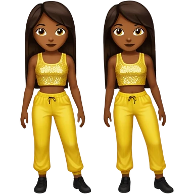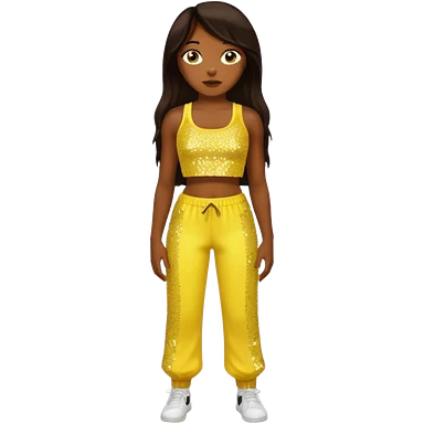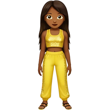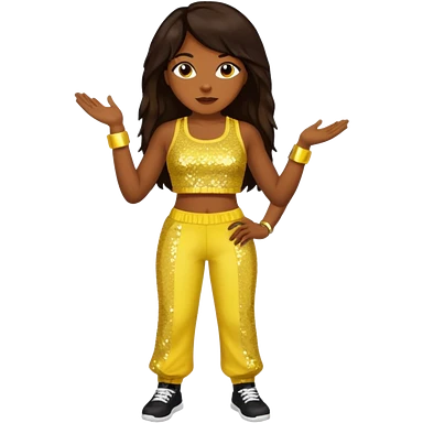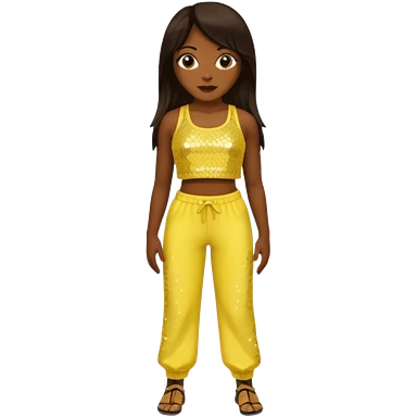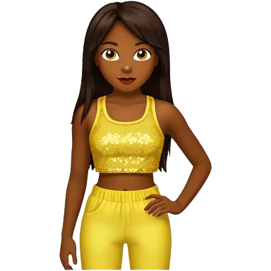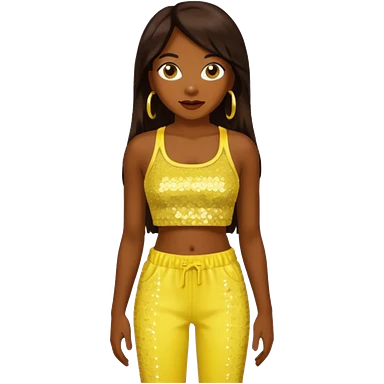 Chilli from TLC with long dark brown hair, yellow sequin crop top and pants, dark skin emoji