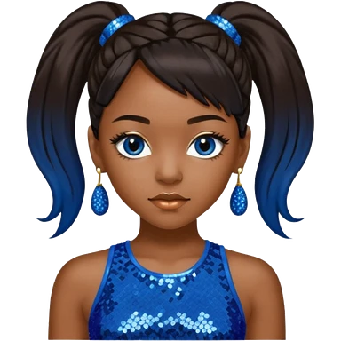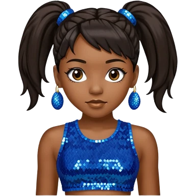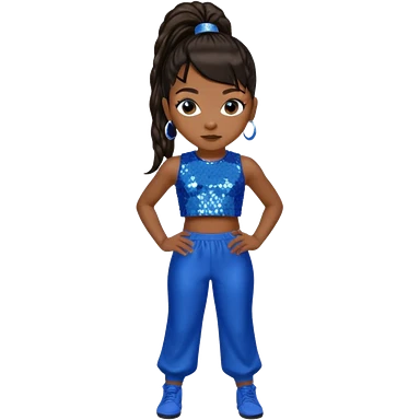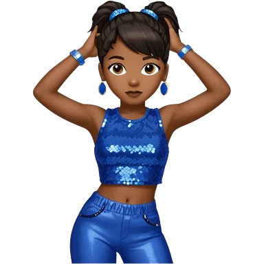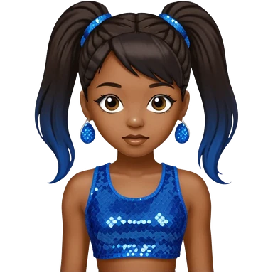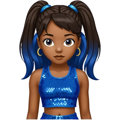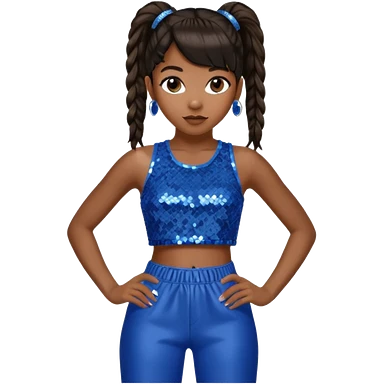 Left Eye from TLC with long dark brown ponytail hair, blue sequin crop top and pants emoji