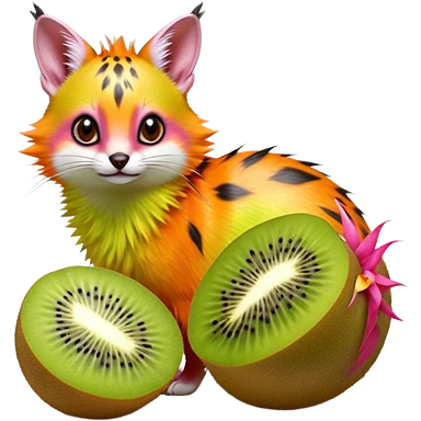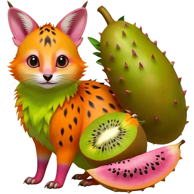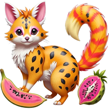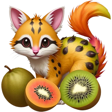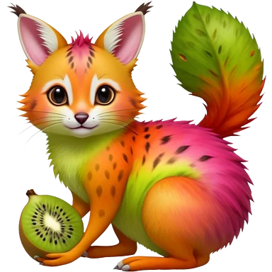 Hyper realistic tropical fruit-splash fur of kiwi-lime, papaya-orange, and dragonfruit-pink chaos beautiful elegant pretty precious cute Fakémon-Pokémon-opossum-feline-serval-caracal-chinchilla-Furret-Minccino-hybrid-creature with a big fluffy bushy tail (full body) emoji