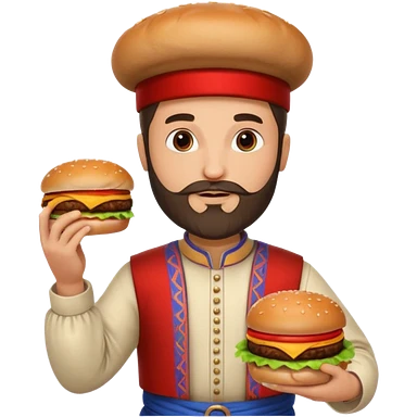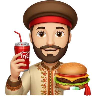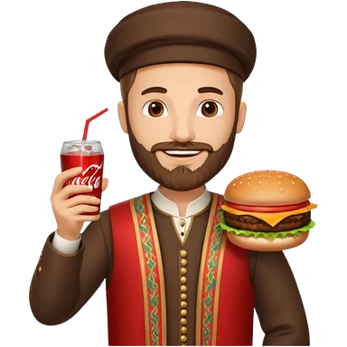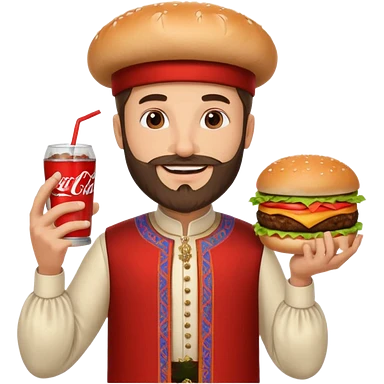 caucasian man with beard and armenian traditional costume, burger in one hand, coke in other emoji