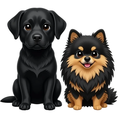 fluffy black and tan Pomeranian dog face, large round dark eyes, small black button nose, soft tan muzzle with subtle smile, two tan eyebrow spots, curious and alert expression, thick fluffy ruff of fur blending black, tan, and light gray, upright triangular ears with gray tips, friendly and cute emoji