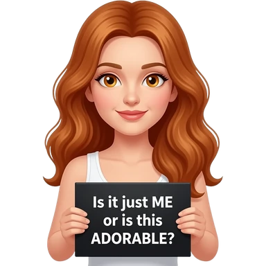 sexy girl with long wavy ginger hair and ginger eyes wearing a white tanktop is holding a black colored sign with Is it just ME or is this ADORABLE written on it emoji