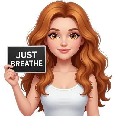 sexy girl with long wavy ginger hair and ginger eyes wearing a white tanktop is holding a black colored sign with JUST BREATHE written on it emoji