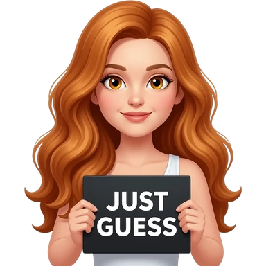 sexy girl with long wavy ginger hair and ginger eyes wearing a white tanktop is holding a black colored sign with JUST GUESS written on it emoji