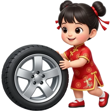 chinese dress cute asian kid playing with big car wheel emoji