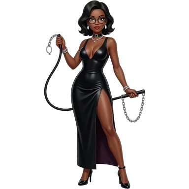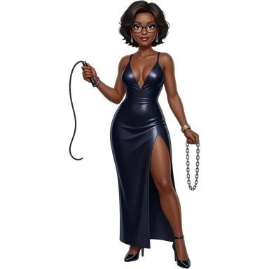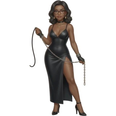 femme africaine dominatrice tres mince et tres noire visage 50 ans fin lunettes debout robe decolletee profond fluide fendue une jambe nue passant dans la fente fouet souple dans la main chaine dans la main droite droite talons aiguilles debout emoji