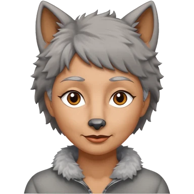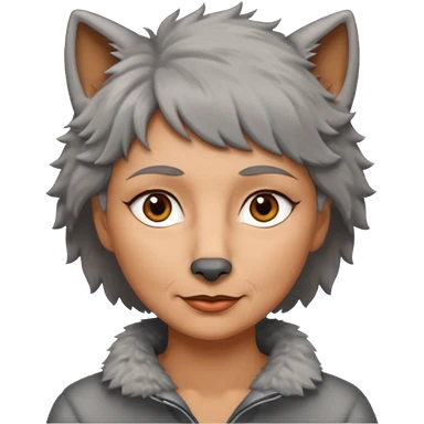 woman 50 years old, short grey fluffy wolf-cut hair, tannes skin and brown eyes emoji