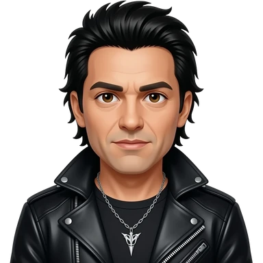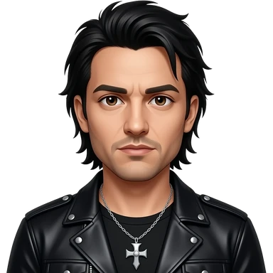 Chino Moreno with dark brown eyes, black spiky hair, black metallic nu-metal outfit, necklace emoji | AI Emoji Generator