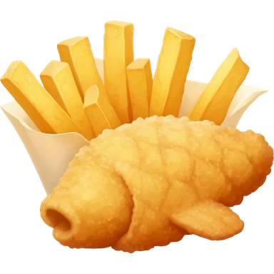 Cinematic Realistic Fish and Chips Dish Emoji, depicted with crispy golden battered fish and chunky hand‚Äêcut chips served in traditional newspaper wrapping, rendered with mouth‚Äêwatering texture and warm natural lighting that captures its quintessential British charm. emoji