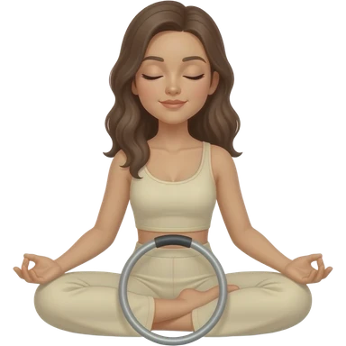 Mujer sentada en posición de loto. Sostiene un aro de pilates frente a ella. Ojos cerrados, expresión calmada. Ropa: conjunto beige o crema. Pelo suelto o recogido bajo. emoji