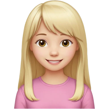 Menina branca de cabelo loiro longo de franja na testa sorrindo blusa rosa emoji