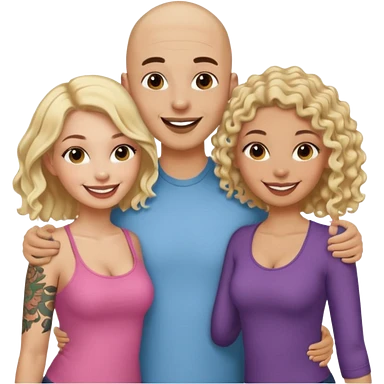 throuple tatted bald boyfriend with two girlfriends, one long blonde hair, other short curly brunette emoji