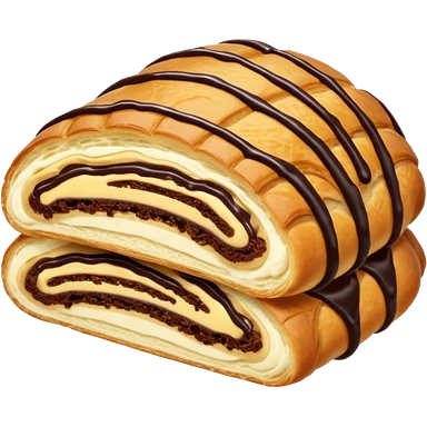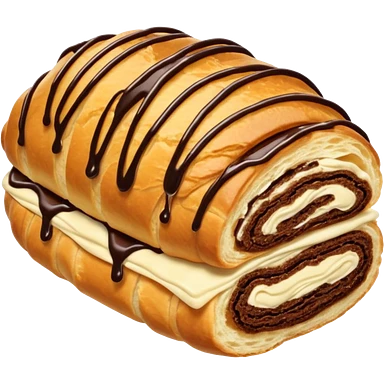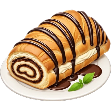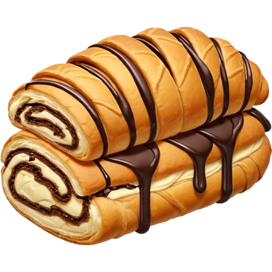 Chocolate-filled croissant roll, golden flaky pastry, chocolate drizzle on top, bite taken, white background, realistic food photo emoji