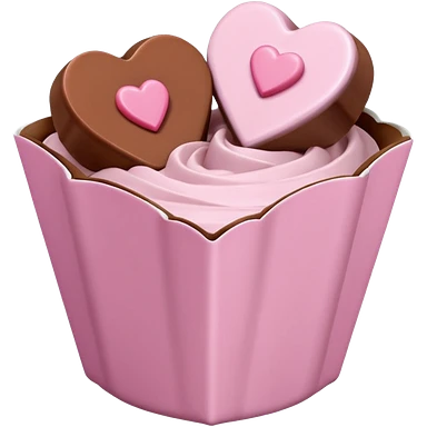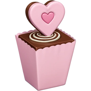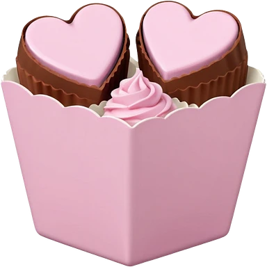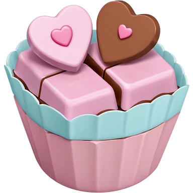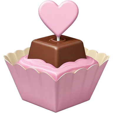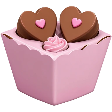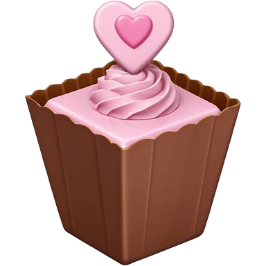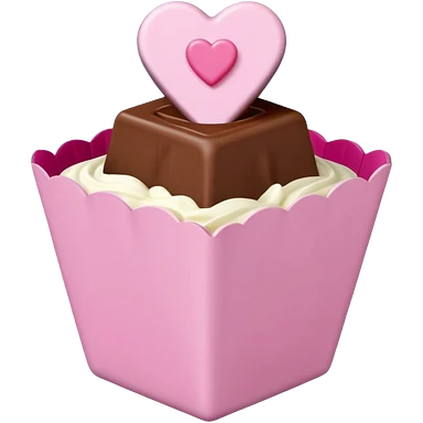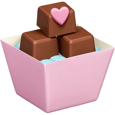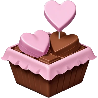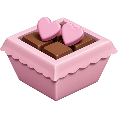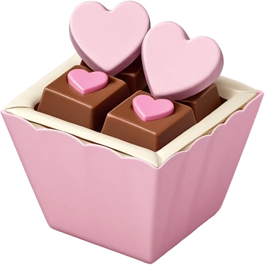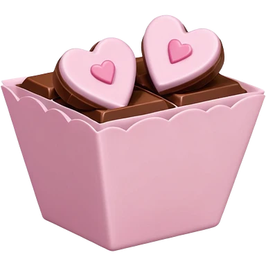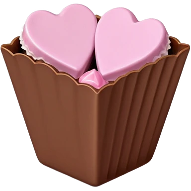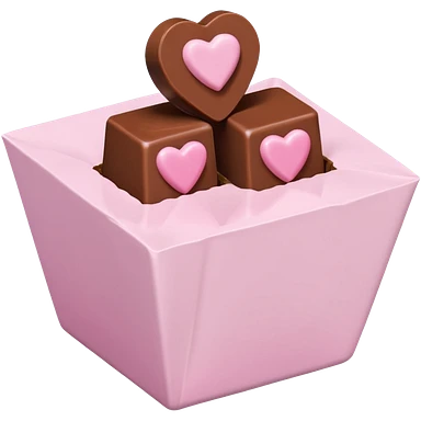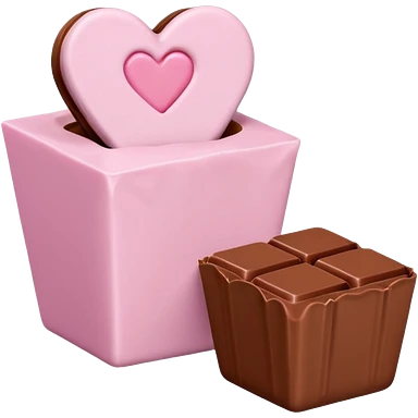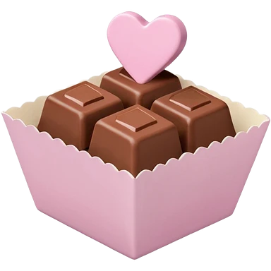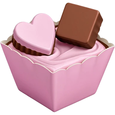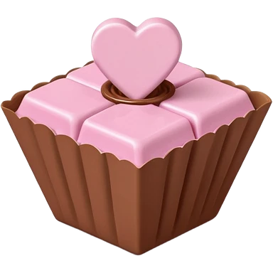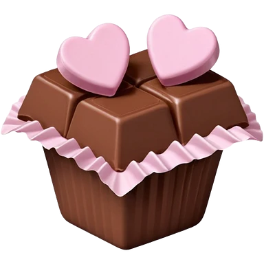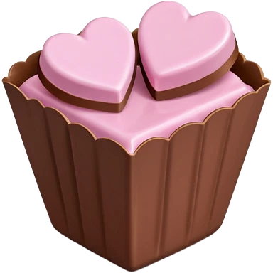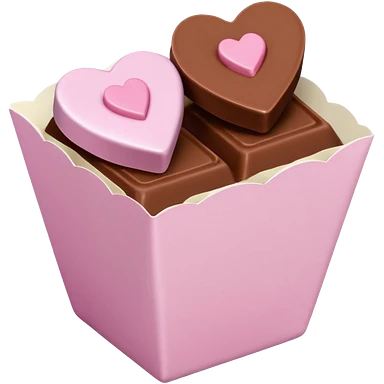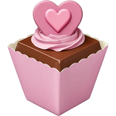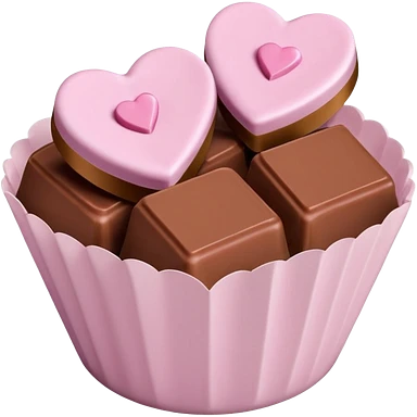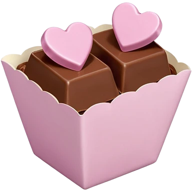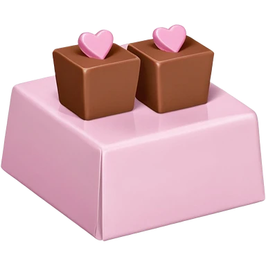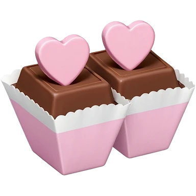 Two glossy square milk chocolate pralines placed diagonally, each in a white ridged paper cup, topped with a soft pastel pink heart icing with subtle sugar sparkle. Cute minimal emoji-style, realistic and polished, clean studio lighting, pure white background, smooth 3D render, high resolution. emoji