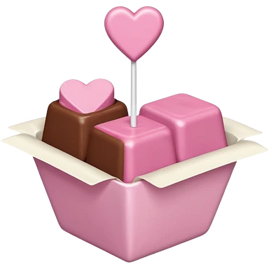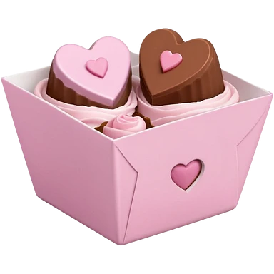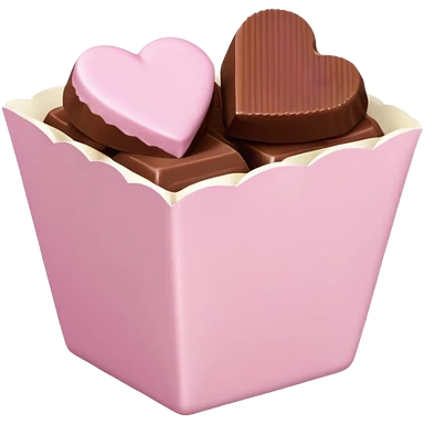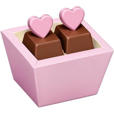 Two square milk chocolate , Each praline is a sharp-edged cube with smooth glossy chocolate coating, placed in a small white fluted paper candy cup. On top of each cube is a flat pastel pink heart-shaped icing emoji