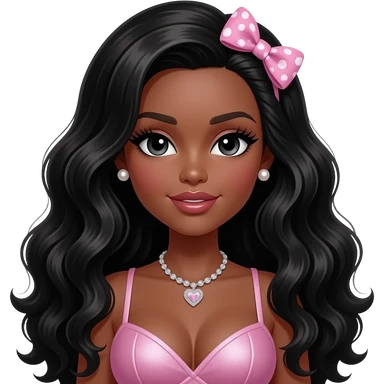chocolate skin tone, Pink big lips, black doll eyes, dark brown skin, Long giant lashes,Doll faced shaped, silver Swarovski heart necklace, big Pearl earrings studs, bimbo, black doll eyes, barbie, darker brown skin with long black hair big breast no bra emoji | AI Emoji Generator