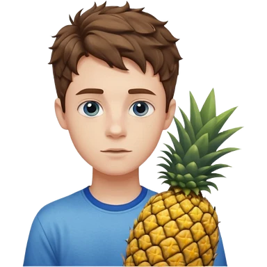 Pale teenage man with short wavy brown hair holding pineapple, prominent jawline, blue eyes emoji
