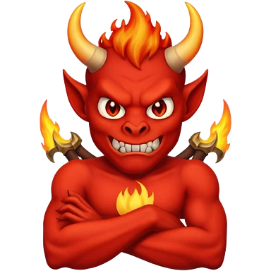 a Red devil, short horn Devil with flaming eyes, crossing arms emoji