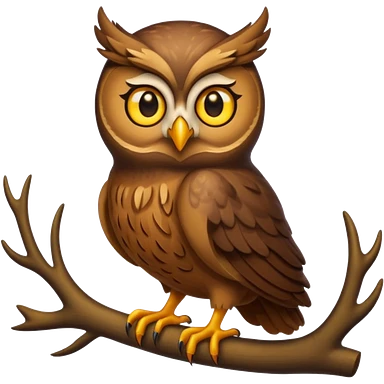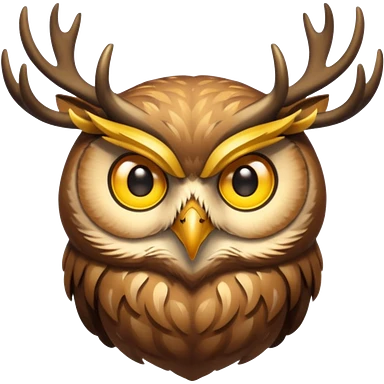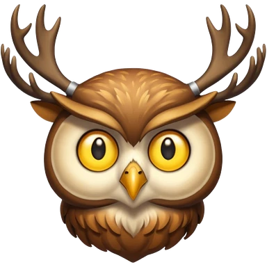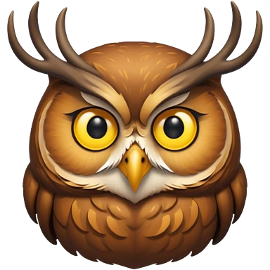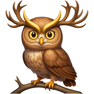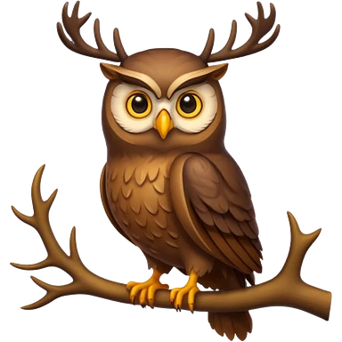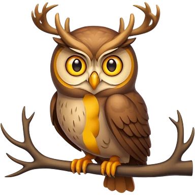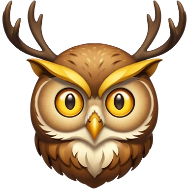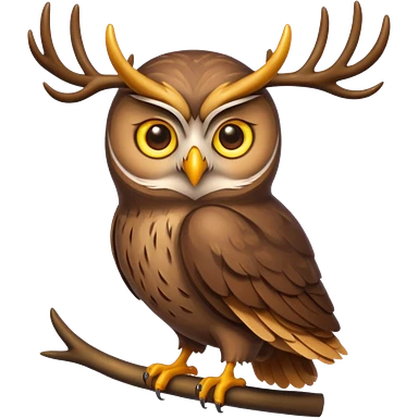 Emoji chouette perchée brun clair, yeux jaunes brillants,bois de cerf imposants sur la tête, sagesse et puissance. Avec majesté emoji