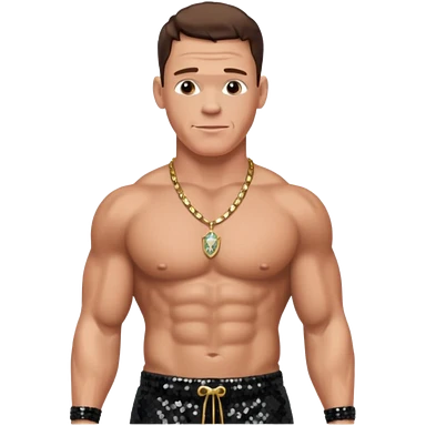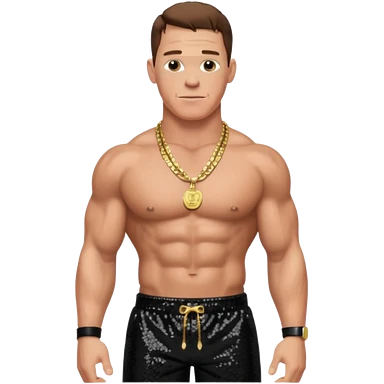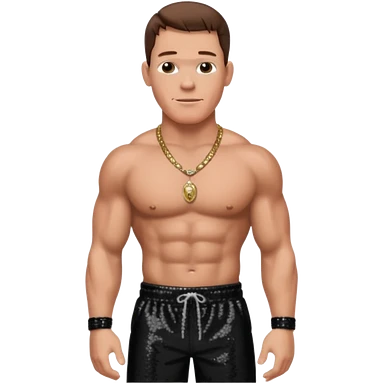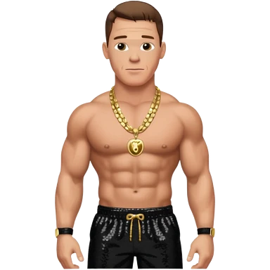 John Cena with black sequin baggy pants, shirtless with necklace, brown hair emoji
