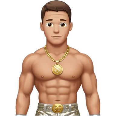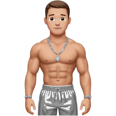 John Cena with silver sequin baggy pants, shirtless with necklace, brown hair emoji